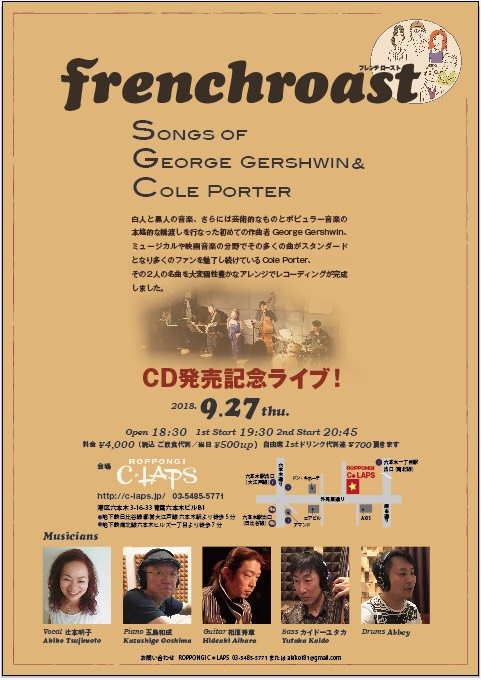 2018年8月1日に発売となったfrenchroastのアルバム「Songs of George Gershwin & Cole Porter」の発売を記念して、9月27日(木)にROPPONGI C*LAPSにてCD発売記念ライブを開催いたします。